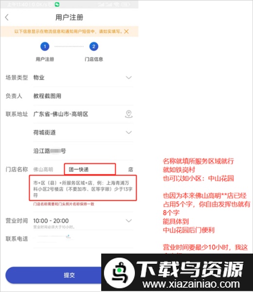 3、跳转至【门店信息】页面,完整填写场景类型、负责人、联系地址、门店名称、营业时间和联系电话,最后点击【提交】;