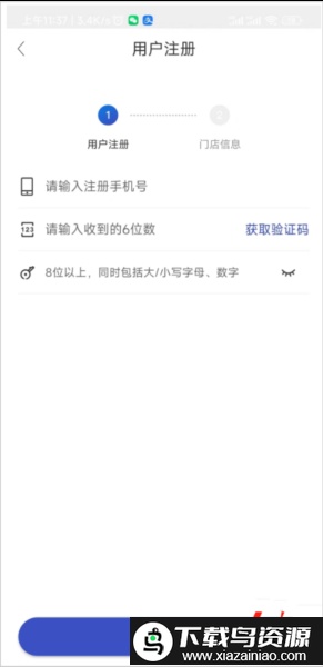 2、进入【用户注册】界面,按顺序填写手机号、验证码及密码,点击下方【下一步】;