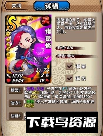 特点:上场需搭配3名吴国武将,灵活性中等。但诸葛恪自带投掷光环,且吴国阵营中拥有可复制将缘技能的陆抗、通过投掷提升攻击的大乔与孙鲁班、以及增加血量的鲁肃等。因此诸葛恪的搭配选择较为丰富,其群体攻击加成能力堪称当前顶尖水平。