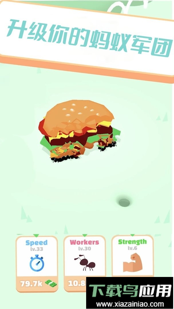 构筑专属的蚂蚁王国,指挥你的蚁群吞噬前进道路上的一切障碍。通过积累资源提升蚁群规模与能力,最终让蚂蚁的足迹遍布每个角落。从初始的一只蚂蚁开始,通过移动与合成实现全体升级,逐步建立强大的帝国。你需要合理分配工蚁,扩大巢穴规模以提升生产效率。游戏操作直观,兼顾轻松放置与离线收益,世界各地的蚂蚁都会为你持续积累财富。
