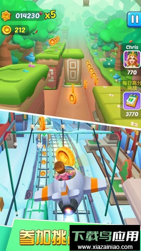 这是一款竖版生存跑酷游戏,玩家将扮演冒险家进入废弃铁路寻宝,却意外遭遇圣诞老人的追逐,需要操控角色持续向前奔跑,灵活执行转弯、跳跃及卧倒等动作,过程中必须避开塌陷路段与各类障碍,逃亡时可通过左右晃动设备收集沿途金币。