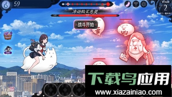 操作十分简单,只需持续点击屏幕;少女便会投出茄子,对恶灵进行净化。每净化一个恶灵都能获得灵石,灵石可用于升级茄子的威力,也能强化灵宠。灵宠会定期发动辅助攻击,提供额外伤害;随着茄子等级提升,少女所骑的猫咪外观也会产生变化。