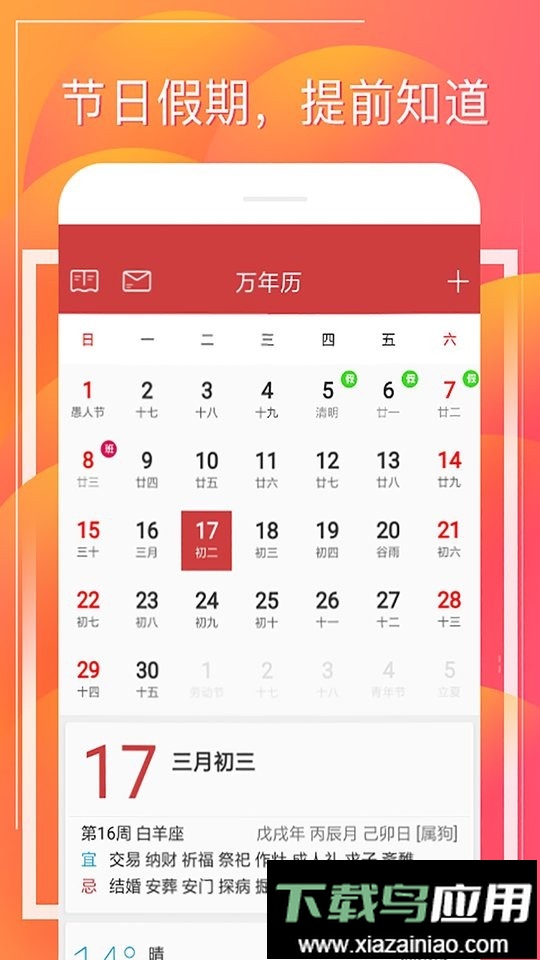 应用清晰标注中国传统节日与节气信息,协助用户合理安排生活计划。