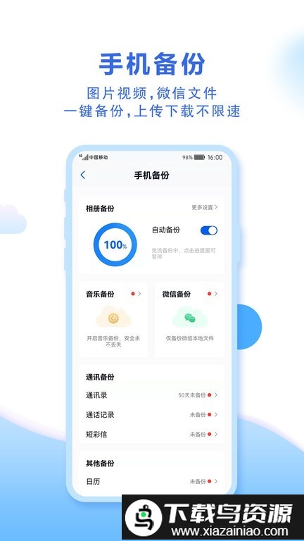 该应用原名和彩云网盘,由中国移动正式推出,主打安全智能、不限速与移动用户免流服务。它支持微信文件、手机相册、通讯录等多种数字资料的存储备份,并实现多设备同步、在线管理与群组共享功能。