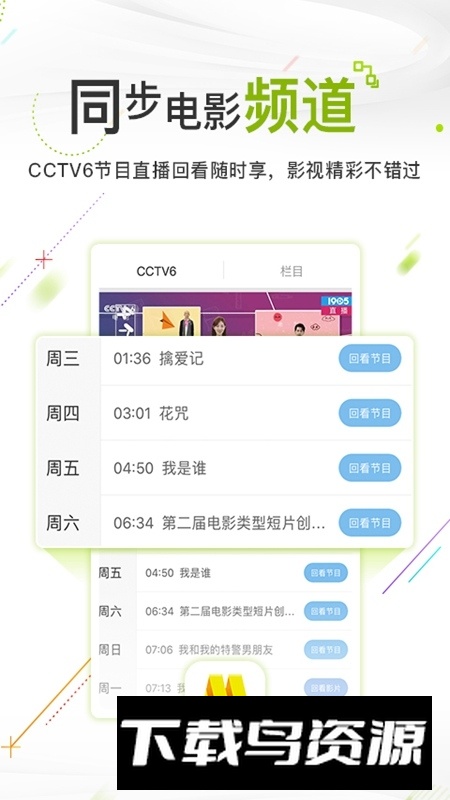 3. 同步CCTV6电视节目直播,支持一周内容回看,用手机即可随时随地观看;