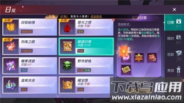 3、旅团日常任务每日可完成20环,完成后可获得经验与星币奖励,每日凌晨5点重置。