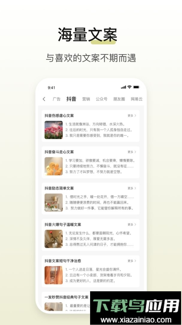 文案生成器app能够快速创作出吸引眼球的文案内容!这款应用为你带来创意灵感,协助你轻松应对不同场景的文案撰写需求,无论是广告宣传、活动推广还是社交媒体发帖。你只需输入核心关键词或挑选合适模板,便能获得多样化的文案选择。让你的文字充满新意与魅力,给读者带来新鲜感受。