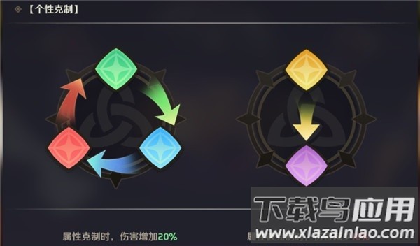 游戏包含五种属性,近似于木、火、水、光、暗的关系。前三种属性依次克制,后两种属性相互克制。克制时会增加额外伤害,被克制时伤害降低,同属性间伤害不变。