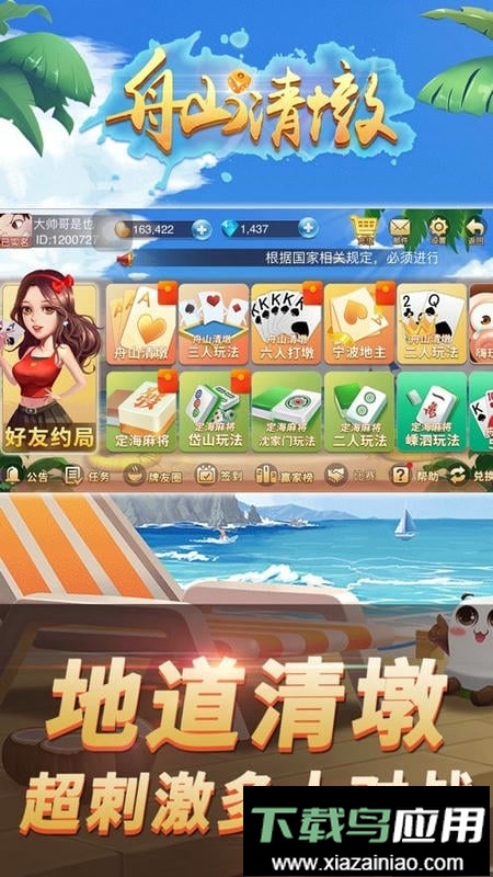 大厅内汇集了多种舟山本地游戏,例如定海麻将、舟山清墩、岱山麻将、嵊泗麻将、四人地主以及510K等。