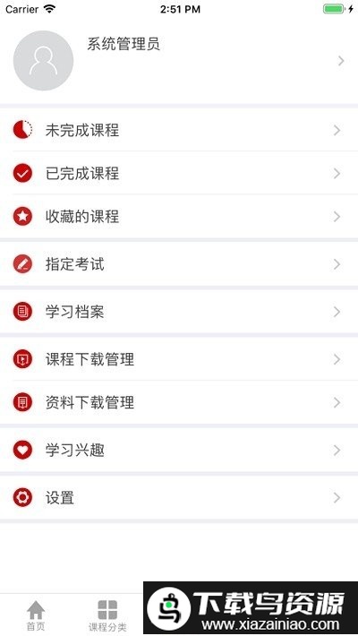 课程与资料管理功能全面,包括我的课程、未完成与已完成课程、收藏课程以及下载管理;
