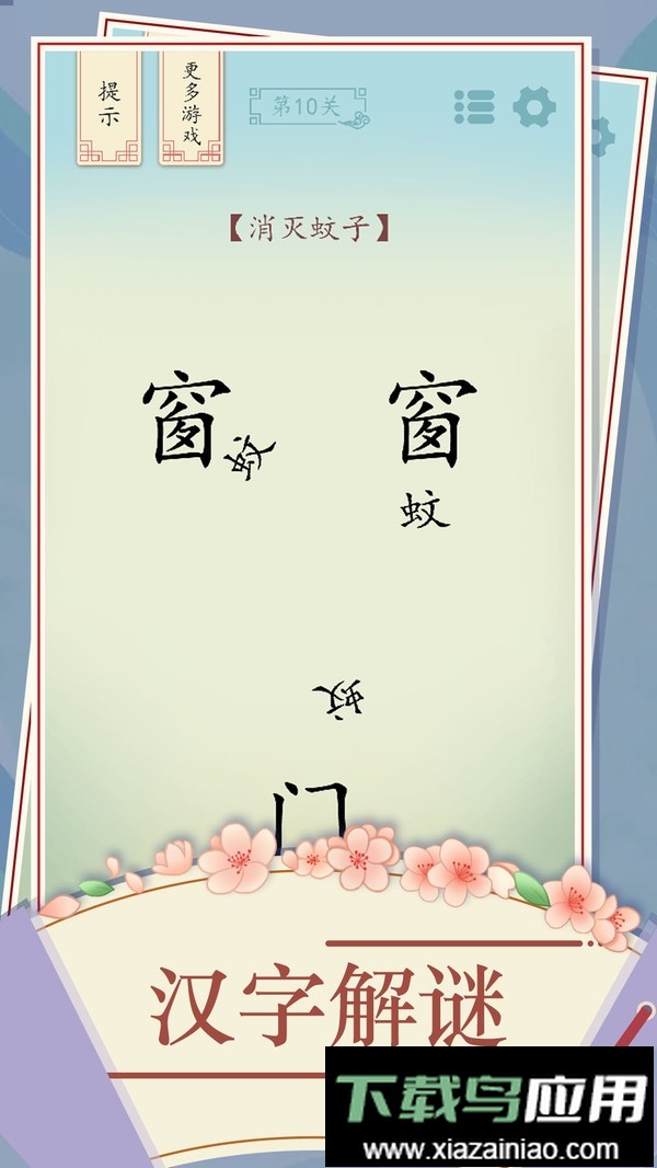 这是一款以文字为核心的解谜游戏,玩家需要对汉字进行拆分、组合,通过改变其含义来找到通关答案。游戏看似简单,实则每一步都需要仔细推敲。请跳出传统的思考框架,尽情发挥你的联想能力,每一关都充满挑战,试试看你能闯到第几关?