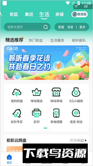 我的套餐、和包支付、优惠券、家庭服务、宽带、云盘、邮箱等信息统一管理。