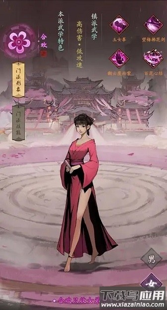 合欢武学特色是高伤害、低攻速;虽多为女子修习,功法却凌厉刚猛,讲究一击制敌,不留余地。