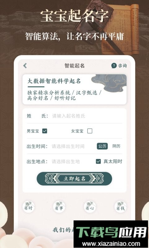 仅需输入姓氏等基本信息即可免费获取大量评分超过90分的优质姓名供您选择依据真太阳时结合出生时间姓名笔画说文解字及大数据科学分析快速为宝宝生成名字并全方位解读名字寓意通过免费起名打造专属吉祥好名让福运相伴一生