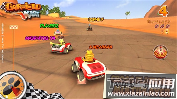 在加菲猫卡丁车手机版里,你将进入一个充满卡通趣味的赛车世界。游戏以大家熟悉的加菲猫故事为背景,画面色彩鲜明活泼。你可以驾驶卡丁车,在赛道上与加菲猫、小狗欧迪等老朋友一同奔驰。游戏准备了多条各具特色的赛道,场景丰富多变。除了单人竞速,还能与朋友一起享受双人比赛的乐趣,多种模式等待你的体验。