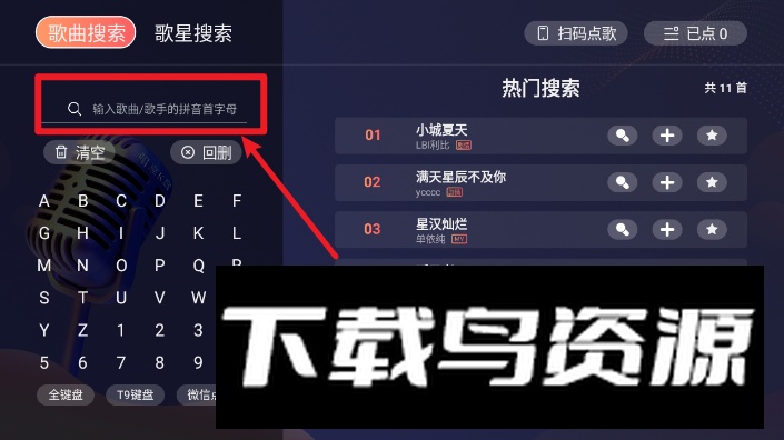 2、进入搜索页面后,可以直接输入字母来查找想要的歌曲。