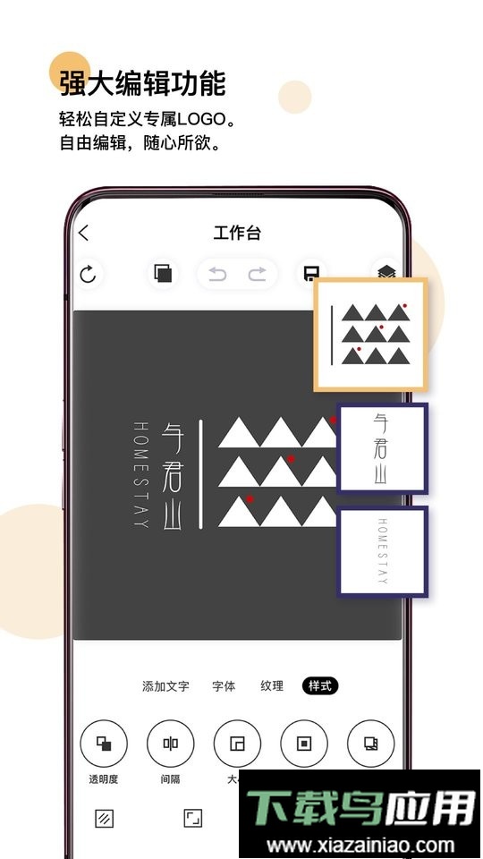界面设计直观易用,支持文字修改、自动颜色搭配、透明度调整、明暗与饱和度设置、特色背景更换以及导入本地图片等多种编辑操作;让LOGO设计过程自由灵活。