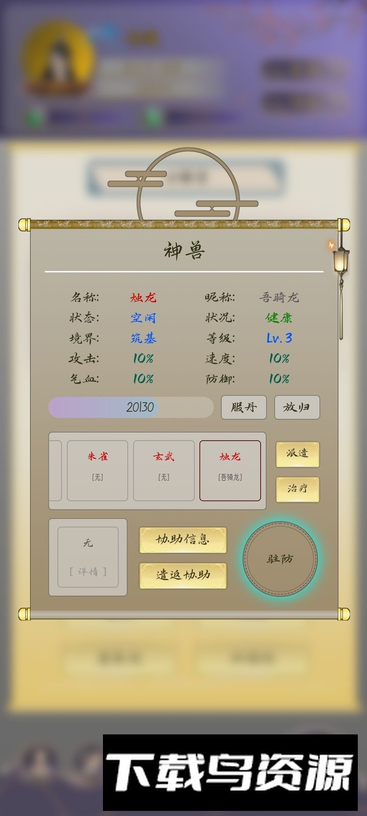 在神兽界面中,可选择目标神兽进行升级,使用兽修丹可提升其等级与境界;派遣出去的神兽可随时撤回,接收方也可主动遣返。