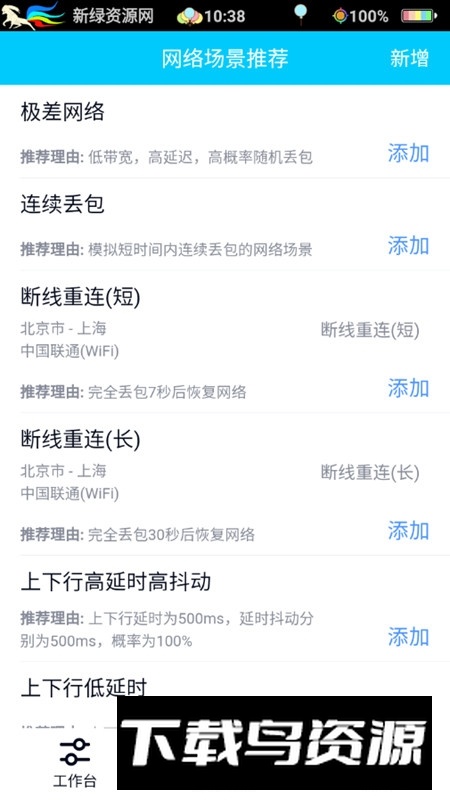 4.添加并设置场景:选择常用网络场景并点击添加,进入参数设置界面;可调整带宽、延时、抖动、丢包等多项参数的默认值;