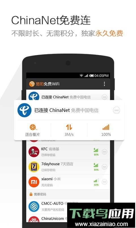 猎豹免费WiFi手机版支持免费接入ChinaNet热点,不限使用时间、无需消耗积分、可实现自动登录,是一款真正方便的手机免费上网工具;该版本新增WiFi安全检测功能,能够智能识别虚假或钓鱼无线网络;同时具备置顶可免费上网的WiFi、查看已保存的密码、连接CMCC时智能提醒等多项系统级WiFi优化特性。