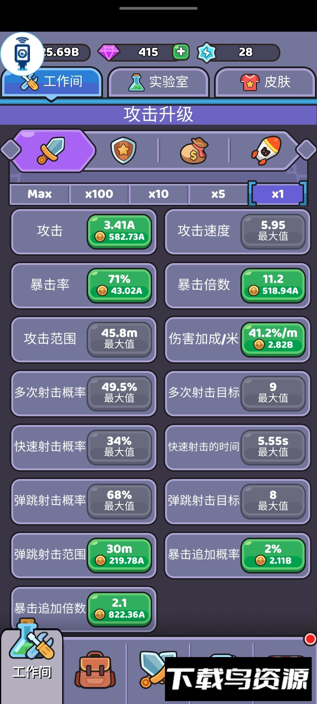 (1)攻击力来源仅为工作间的攻击力与终极武器的攻击力,不受其他加成;工作间攻击力最高仅几C级,而终极武器升至五千级可达D级,因此攻击力无需专门升级;