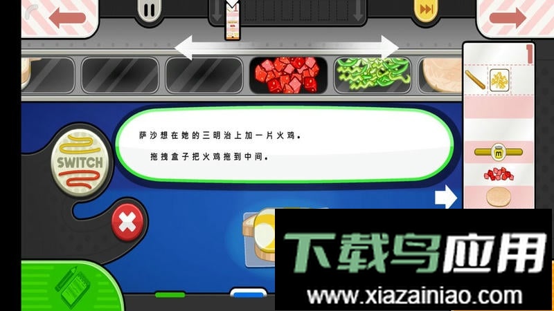 【选择材料】首先从丰富的食材库中挑选所需材料,游戏后期会解锁更多种类;选定食材后,必须按照顾客指定的顺序进行摆放。