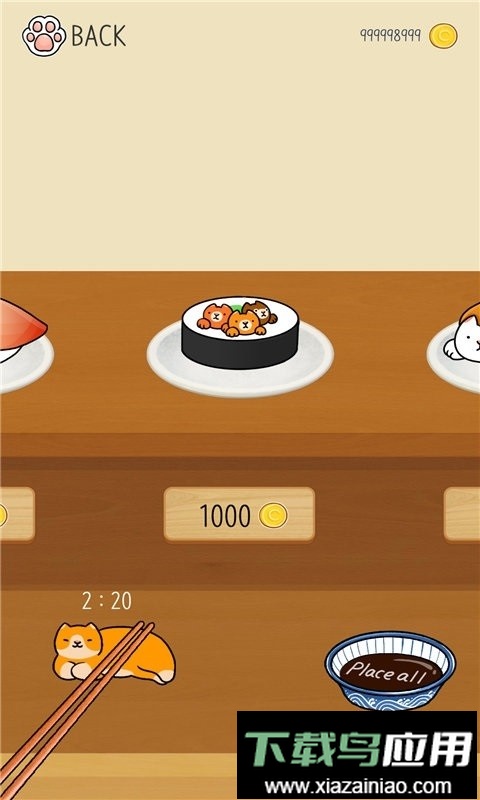 屏幕上方有一条回转寿司带,各式各样的猫咪和寿司会从上面飘过;点击屏幕即可让选中的目标落下。把握好点击时机,让落下的猫咪寿司能够平稳地堆在桌上;看看你最终能堆多高,叠起来的寿司猫就都是你的了。