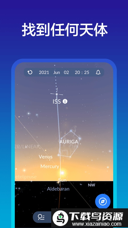 1. 举起手机对准天空,交互式星图便会实时显示当前视野中天体的准确位置。