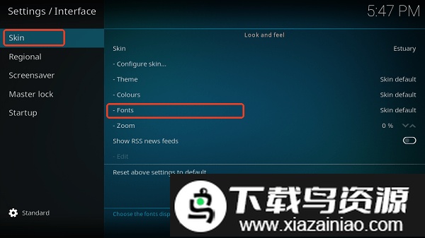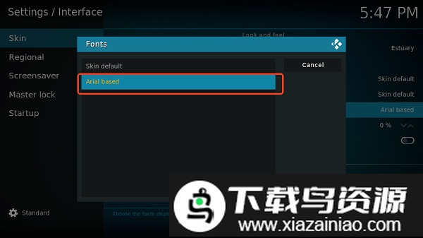 2、在皮肤选项中找到字体设置“Fonts”,将默认字体“Default”更改为“Arial based”;