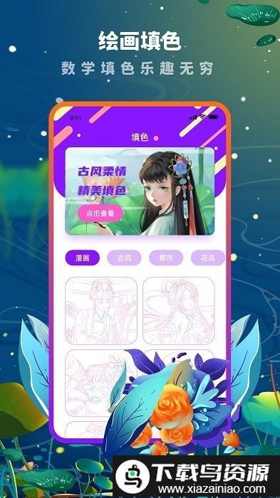 打开这款手机上的涂色软件,你能体验到多种不同风格的画面,包括古风人物、精致饰品、各类花卉、二次元主题等;免费画作持续更新,还有大量精美图片等待你来发现。尽情享受涂色的乐趣,让烦恼与压力随之消散。体验流畅操作,保存并见证你的每一幅创作。