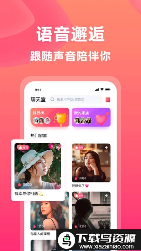 这是一个专注于实时语音互动的交友平台,融合了语音聊天、声音交友与陪伴功能,旨在成为当下年轻人喜爱的社交工具。通过语音连麦畅快对话,用声音遇见让你心动的人,开启一段纯粹的声音恋爱。你可以随时分享心情、倾诉烦恼,在这里找到能带来温暖的那个ta,让陪伴随时都在。