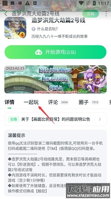 2、在游戏详情页面找到“一起玩”功能,点击进入。