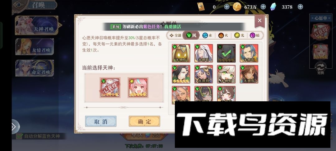 2.游戏内设有多类卡池:天神召唤、友情召唤与命定召唤。天神召唤累计100次后开启心愿单,可提升指定天神的出现概率;友情召唤消耗友情点;命定召唤使用圣杯道具,有15%几率获得五星天神,建议集中抽取某一系别。