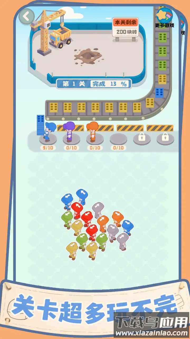 这是一款指挥工人搬运砖块建造房屋的益智游戏。玩家需要扮演现场指挥,根据砖块的不同颜色来合理分派工人,确保他们顺利搬运对应的砖块,最终协力建造起一座小型社区。