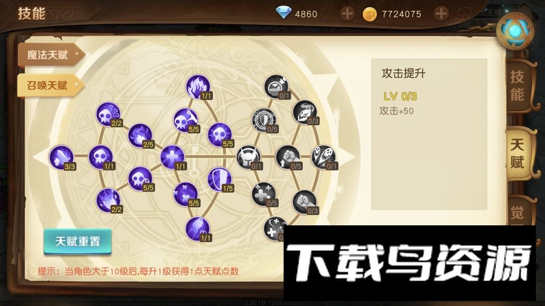 2.10级后,技能栏下方开放天赋系统,学习后决定职业路线,并解锁新技能。