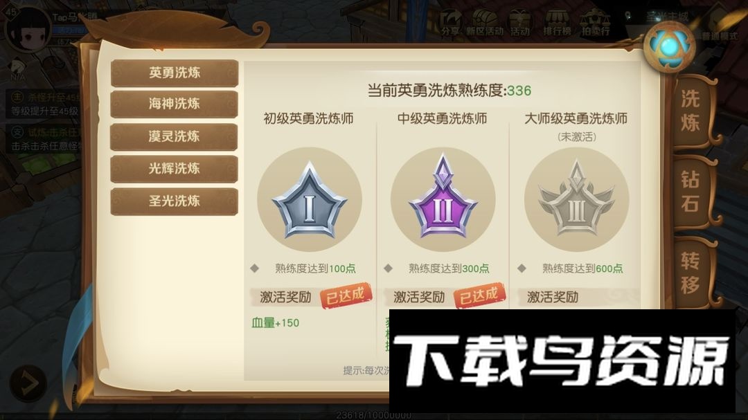 4.多余装备可回收换取经验与装备碎片,这是另一重要经验来源;装备碎片用于提升装备部位等级,建议前期升至4-5级即可;剩余碎片可兑换洗练石,前往装备洗练处提升熟练度,熟练度提高后提供各类属性与增益;洗练属性时选择紫色或金色装备,每5颗石头随机增加1-5点熟练度;刷熟练度则选用白色装备,每颗石头固定增加1点;紫色及以上装备洗出的属性可用金币转移。