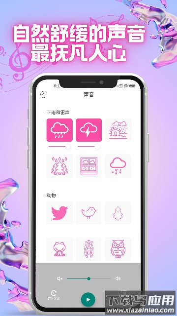 进入“声音”页面,可以从“下雨和雷声”、“动物叫声”等二十一种自然音效中自由选择。通过滑动条可以调节音效的音量大小,帮助你营造一个沉浸式的舒缓环境。