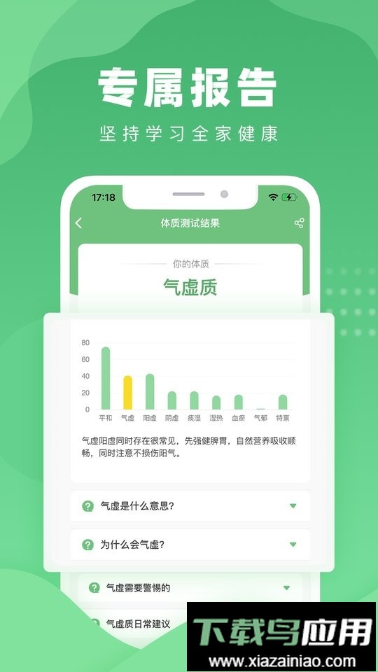 用户可通过测试了解自身体质,系统自动生成专属养生报告,从常见问题、饮食、运动、功法、情绪调节、穿衣起居等七个维度给予指导,并随二十四节气更新内容;