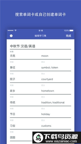 这是最基础的卡片形式,帮助理解汉字含义。点击卡片上的喇叭图标即可听到发音,使用者能独立完成对字词形状、意义和声音的学习与复习。