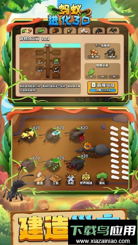 蚂蚁生存3d是一款以蚂蚁社会为蓝本的休闲策略游戏,核心在于模拟生存与进化历程。玩家通过上帝视角进行操作,指挥蚂蚁采集食物资源、守护巢穴、培育后代,并与其他玩家展开资源竞争,从而持续发展自己的蚁群势力。