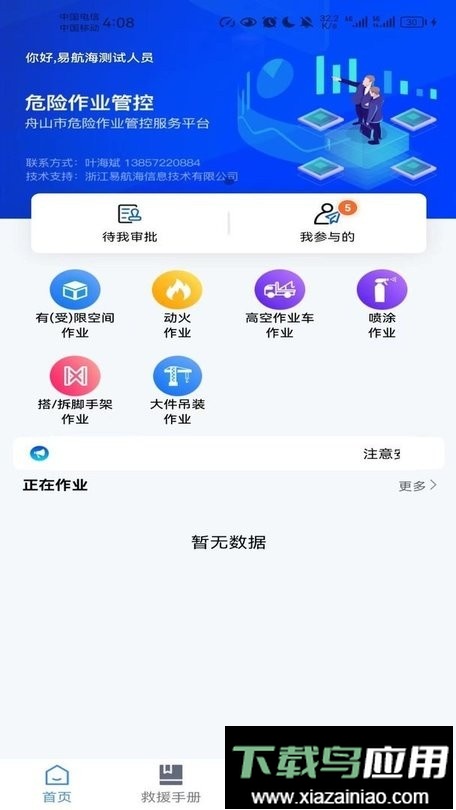 舟山市企业危险作业全过程管控系统,简称危险作业管控,由浙江易航海信息技术有限公司研发。这是一款基于互联网技术的智能应用,提供有限空间作业、动火作业、高空作业车作业、大件吊装作业、脚手架搭拆作业、油船进厂作业等多项基础服务。该应用同时集成在线监测、智能分析与跟踪处理等功能,为强化企业安全生产、防范遏制较大事故、维持安全生产形势稳定提供坚实支撑。