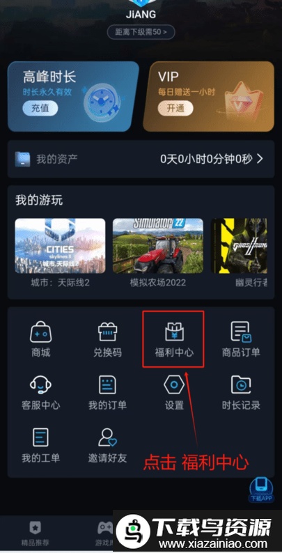 第一步:首先打开九一云游戏应用,进入主界面后点击右下角“我的”选项,随后找到并进入“福利中心”页面。