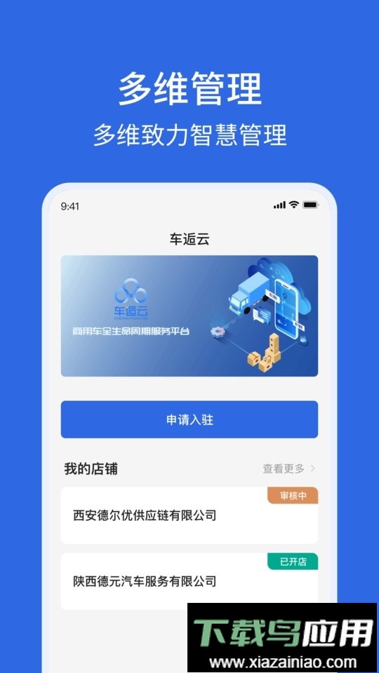 这是一款面向商用车维修店及汽配商户的管理服务应用。商户可开通并管理自己的店铺,后续将支持线上接单、开单处理以及上游配件采购等功能。