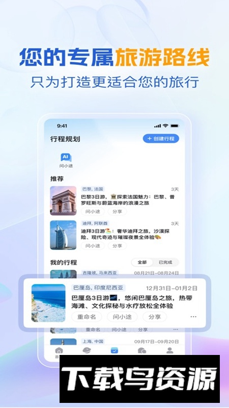 1.智能行程规划:依据您的兴趣偏好、时间安排与预算,自动生成个性化旅行方案,推荐新鲜有趣的玩法,带来更多旅途惊喜。