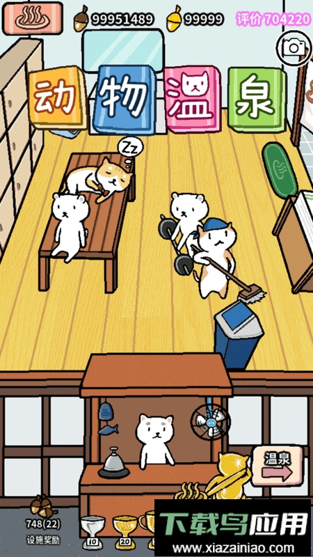 在动物温泉这款休闲模拟经营游戏中,你将协助可爱的喵星人享受泡澡时光。通过准备各类沐浴用品,吸引更多动物朋友前来光顾,从它们身上收集橡子,并逐步升级温泉的各类设施。游戏支持放置玩法,即使离线也能持续积累收益,现在就开启这段温馨的经营之旅吧。
