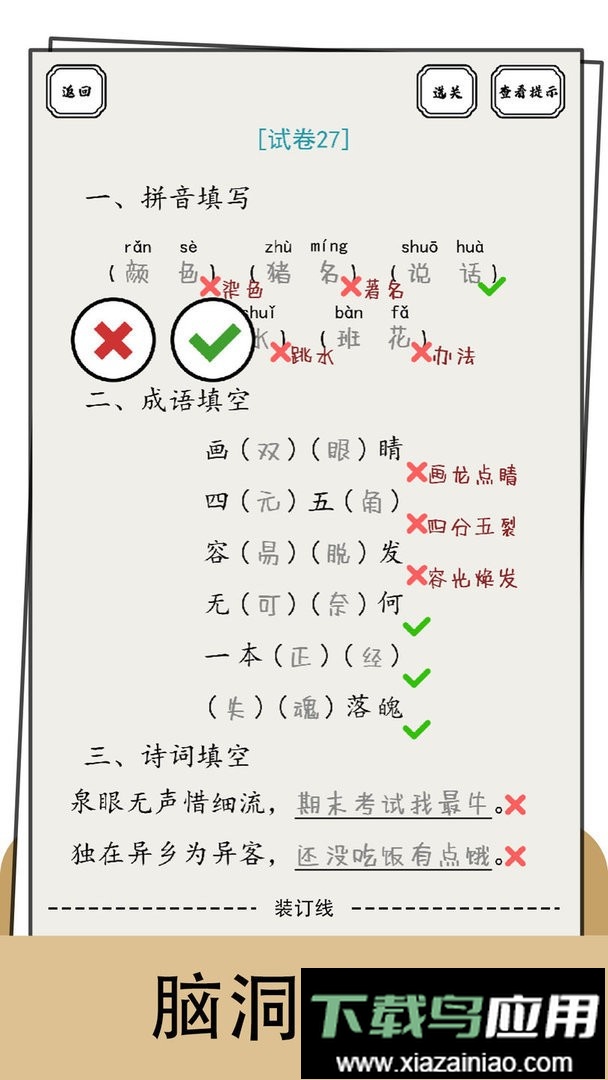 这是一款需要你调动智慧来批改作业中错误答案的游戏。题库丰富多样,不仅包含常规试题,也融入了诗词、成语组合等文化元素。整体氛围轻松有趣,能充分激发你的想象力,快来试一试吧。
