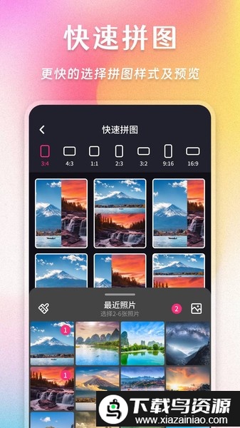 这款应用集成了模板拼图、自由拼图以及长图拼接等多种模式;同时具备一键抠图换背景、头像卡通化、智能美化、照片动漫化、老照片上色、形状变化和宫格切图等实用功能。它提供了海量模板与滤镜,支持添加特效、文字、背景、边框、批量水印、贴纸及马赛克,助你轻松打造完美图片。