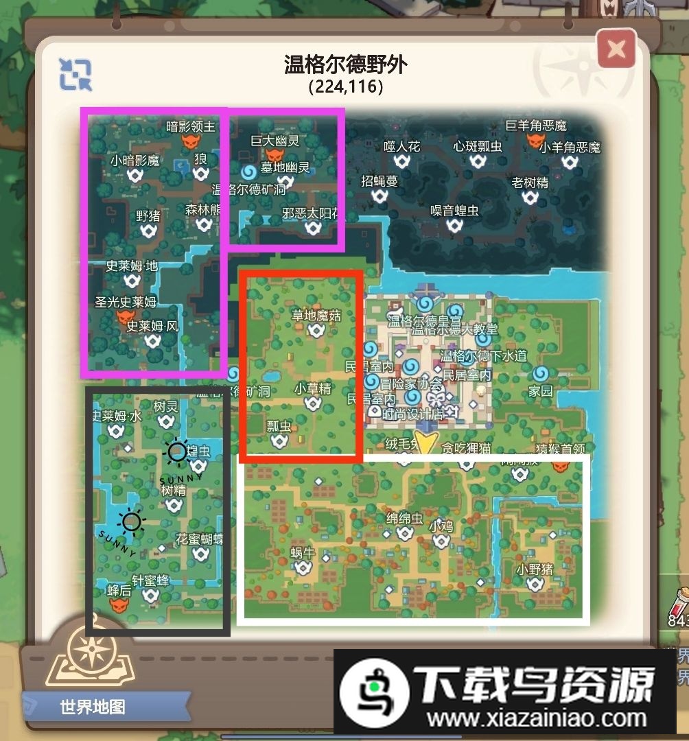 矿洞内的矿石类采集点;小框区域为采集点较为集中的位置。