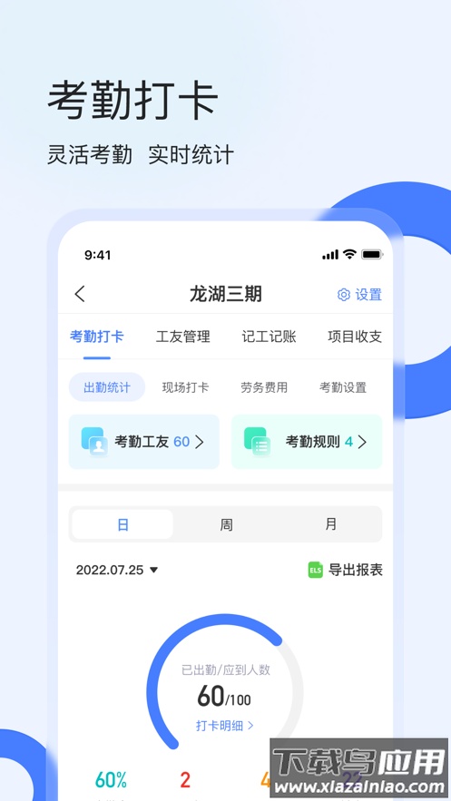 所有打卡数据生成详细报表并支持导出,班组管理者能随时查看每位工友的打卡状态,正常打卡与外勤记录均可便捷管理。