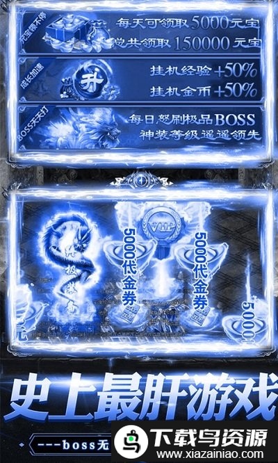 该作是一款融合了MMO与RPG要素的神兽主题传奇游戏;每日登录即可获得大量代金券,BOSS挑战次数无限制,代金券在各类场景中均有掉落,无需额外投入即可享受完整内容;游戏还引入了全新的神兽体系,让战斗体验更加丰富多变。